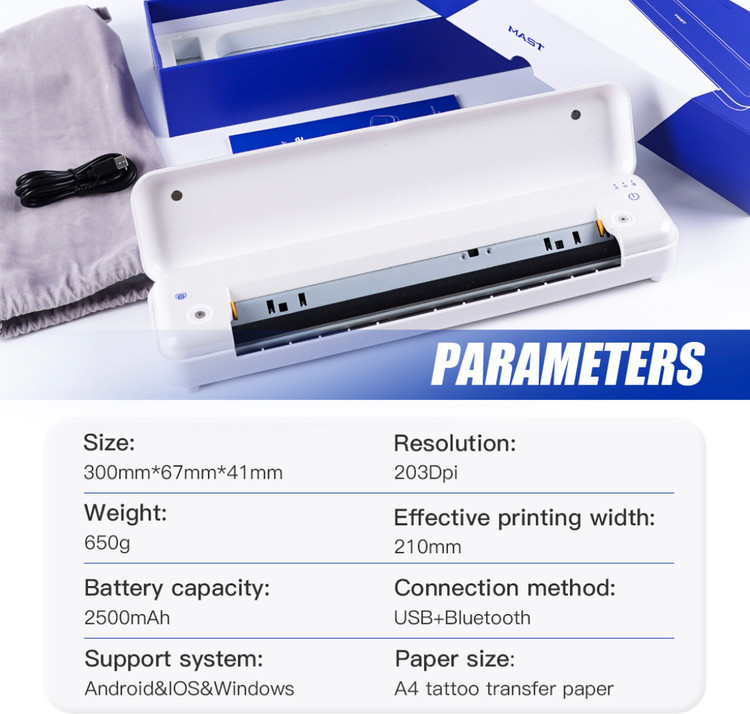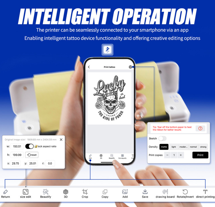 عملکرد هوشمند و انتقال آسان: به راحتی از طریق یک برنامه برای ویژگی های دستگاه خالکوبی هوشمند، از جمله ابزارهای ویرایش خلاقانه، به تلفن هوشمند خود متصل شوید. ویرایش های سریع و ایجاد سند انتقال بهینه ساده هستند و کارایی را افزایش می دهند. برای تطبیق پذیری، از اتصال Type-C به رایانه برای چاپ نیز پشتیبانی می کند.