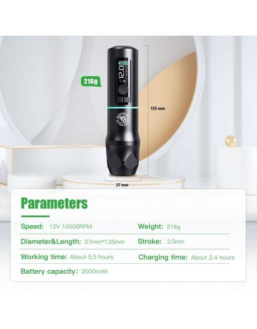 با باتری 2000 میلی آمپر ساعتی را برای استفاده طولانی مدت مجهز به موتور Mcore-A3، دقت و عملکرد فوق العاده ای را ارائه می دهد. ساخته شده از آلومینیوم درجه هوافضا، بادوام، مقاوم در برابر سایش و تمیز کردن آسان است. عملکرد بی صدا و قابلیت رنگ آمیزی سریع آن محیطی راحت را برای هنرمند و مشتری ایجاد می کند. تنظیم دقیق ولتاژ نتایج ثابت و قابل اعتماد را تضمین می کند. خلاقیت خود را بدون محدودیت های کابلی آزاد کنید.